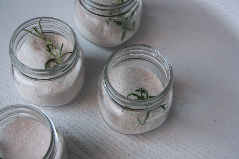 Laita suola isoon kasariin/paistinpannuun. Minä laitoin neljä 500 g Himalajan kristallisuolaa ja noin seitsemän oksaa. Lämmitä suola keskilämmöllä noin 10 minuuttia. Kymmenen minuutin jälkeen ota pois liedeltä ja anna täysin jäähtyä. Kun suola on jäähtynyt, peitä ja anna olla vuorokauden huoneenlämmössä. Ota oksat pois ja siivilöi. Kaada purkkeihin ja lisää jokaiseen purkkiin yksi pieni rosmariini oksa.