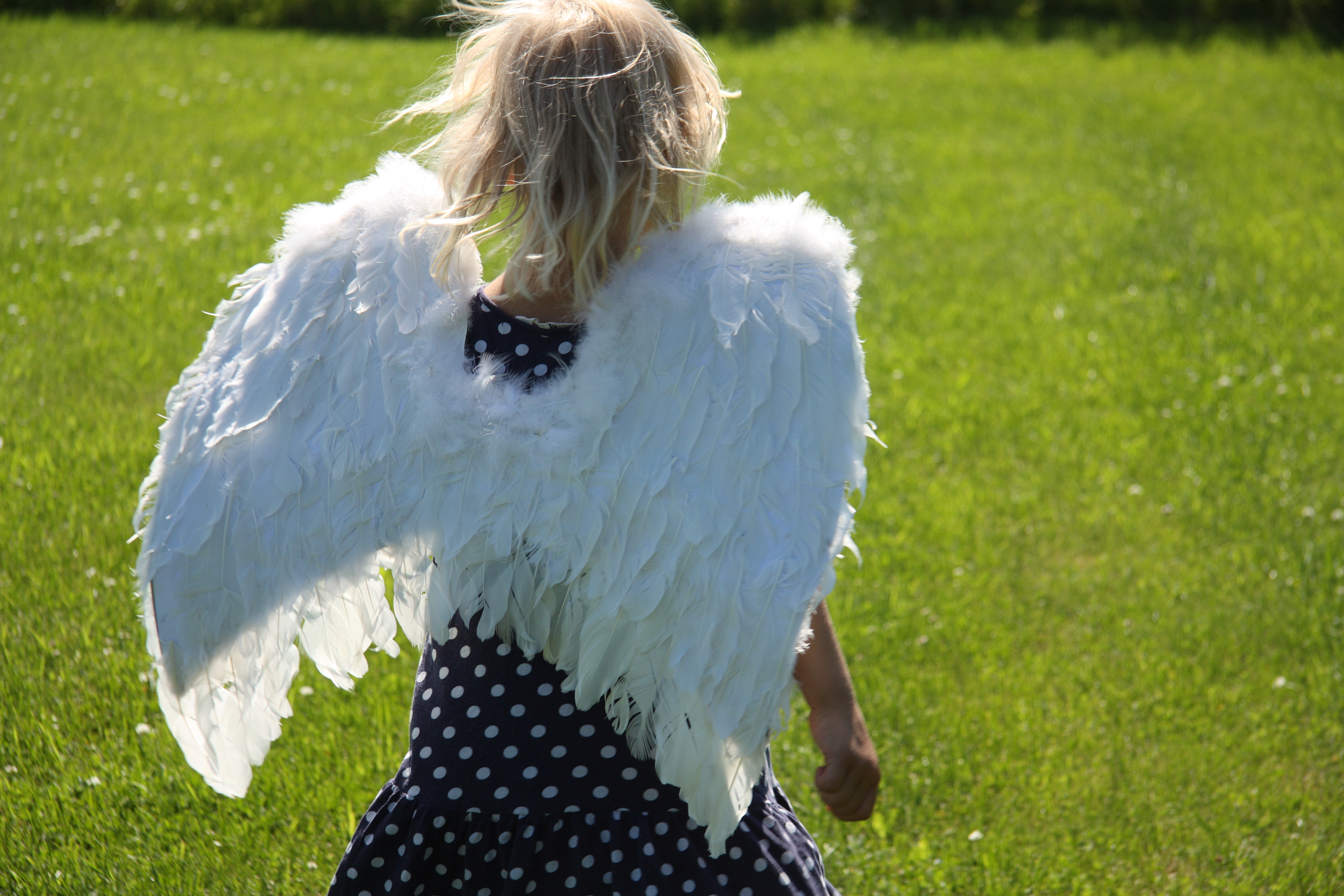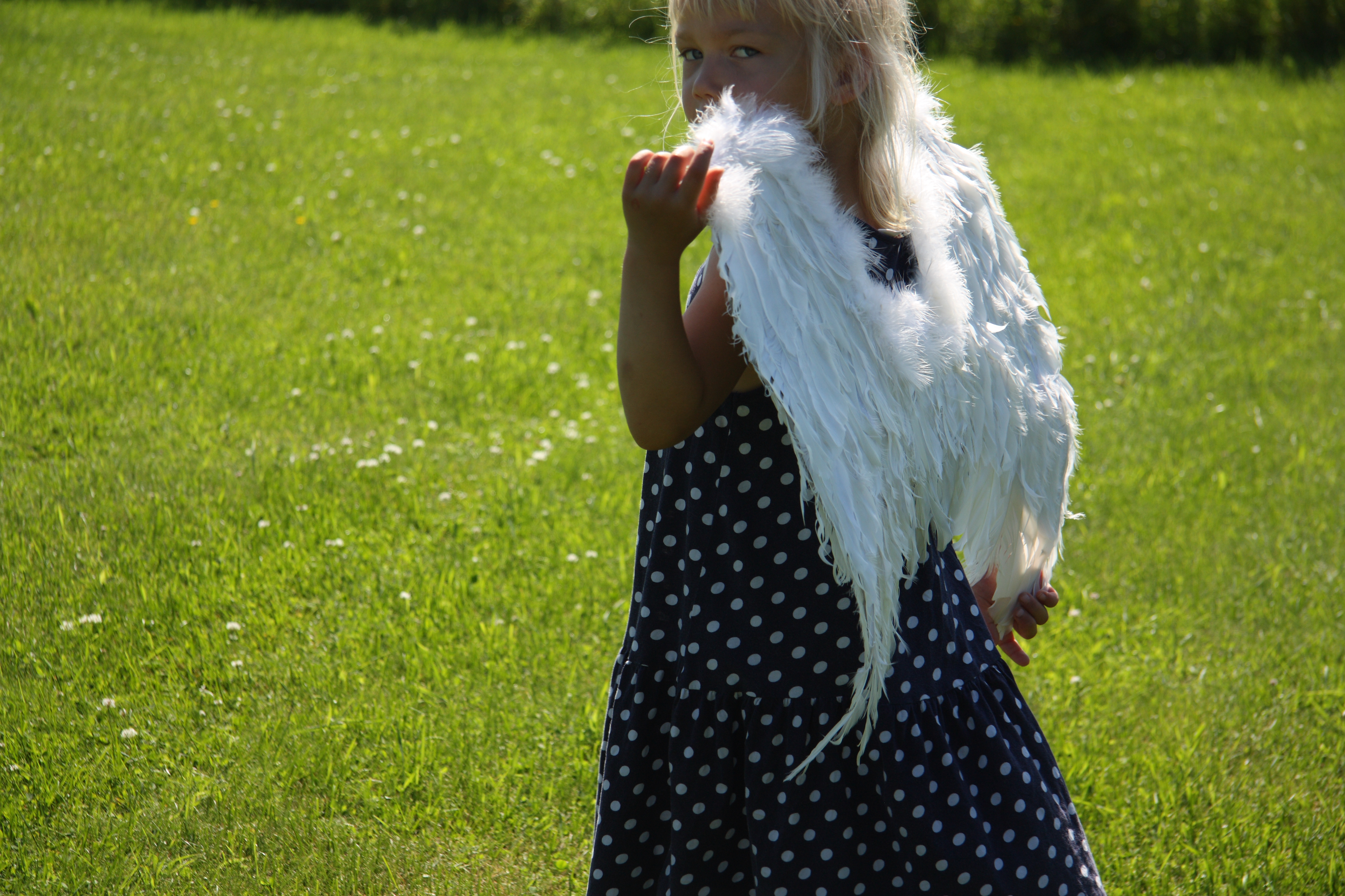 Kun tultiin kotiin, aurinko paistoi niin kuin sen kuuluukin paistaa heinäkuussa. Bella Prinsessa on parhaillaan vaatteiden vaihtovaiheessa. Ei mennyt kuin kaksi minuuttia niin hän oli vaihtanut sortsit ja t-paidan hellemekkoon. Hän kävi ulkona pyörähtämässä ja kohta tuli kysymään että saisiko hän enkelisiivet niin voisi leikkiä keijua. Siellä se keiju sitten juoksenteli pitkin nurmikkoa ja välillä poimikukkia. Ja minä tietysti lähdin kameran kanssa tytön perään.