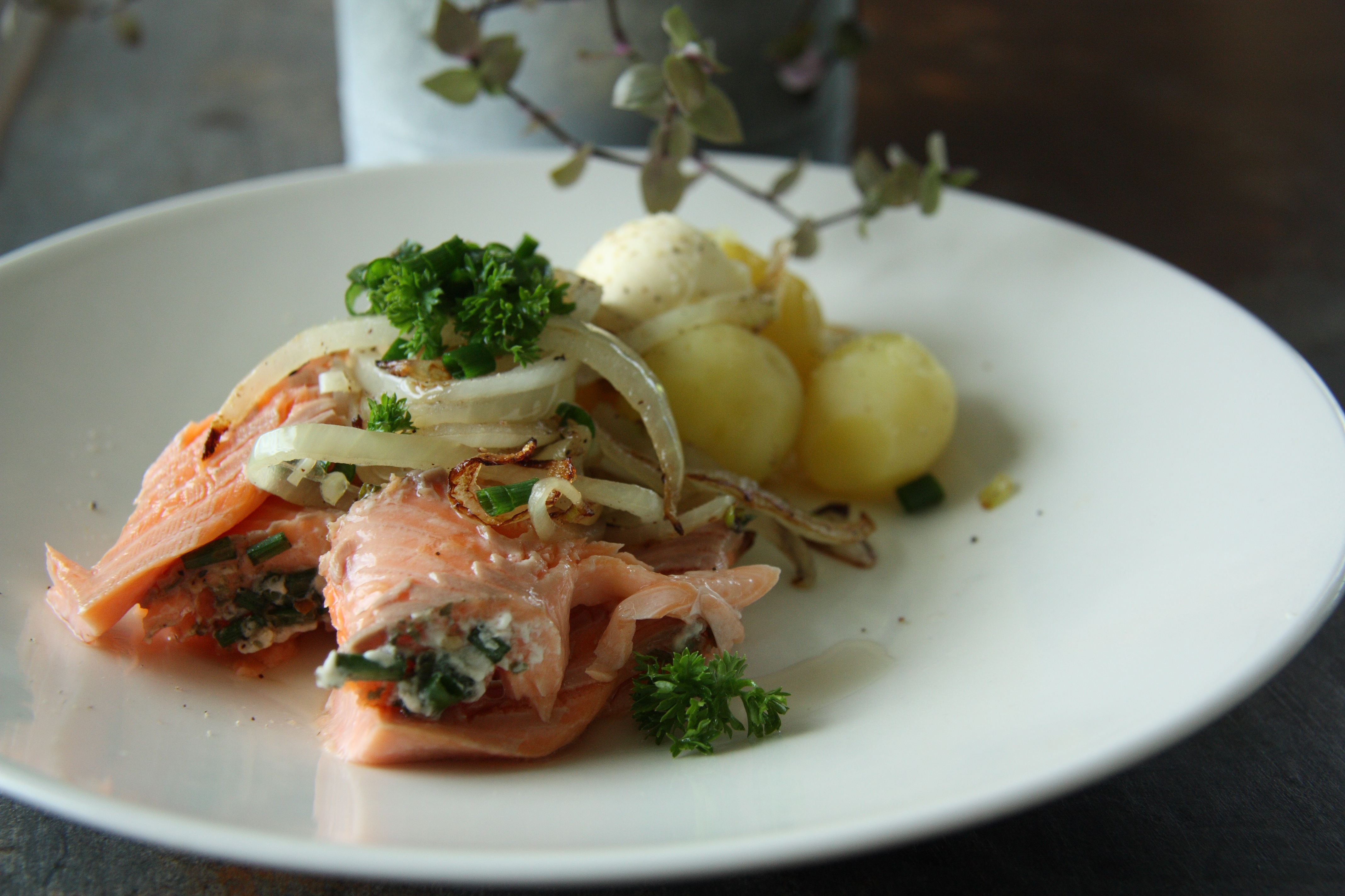 Tein viiltoja kirjoloheen niin kuin olin kerran nähnyt yhdessä Jamie Oliver ruokavideossa. Hieroin väleihin ja kalan sisälle sormisuolaa, mustapippuria, ruokosokeria ja kuivattua tillia. Lisäsin vielä ripaus Piri piri mausteseos tuomaan hieman tulisuutta. Laitoin sitruunaviipaleen puolikkaita viiltohin ja kokonaisia viipaleita kalan väliin. Leikkaa saksilla väliin ja päälle ruohosipulia ja tuoretta tilliä jos sinulla on se saatavilla. Sitten käärin folion niin että se muodosti teltan joka antaa tilaa höyryllekin. Paistoin kalan uunissa noin 180 C ja noin puolituntia. Tarjoile uusien perunoitten ja pannulla karamellisoitujen sipuleitten ja skarppinäkkärin kera. Viimeistele persiljalla ja ruohosipulilla.