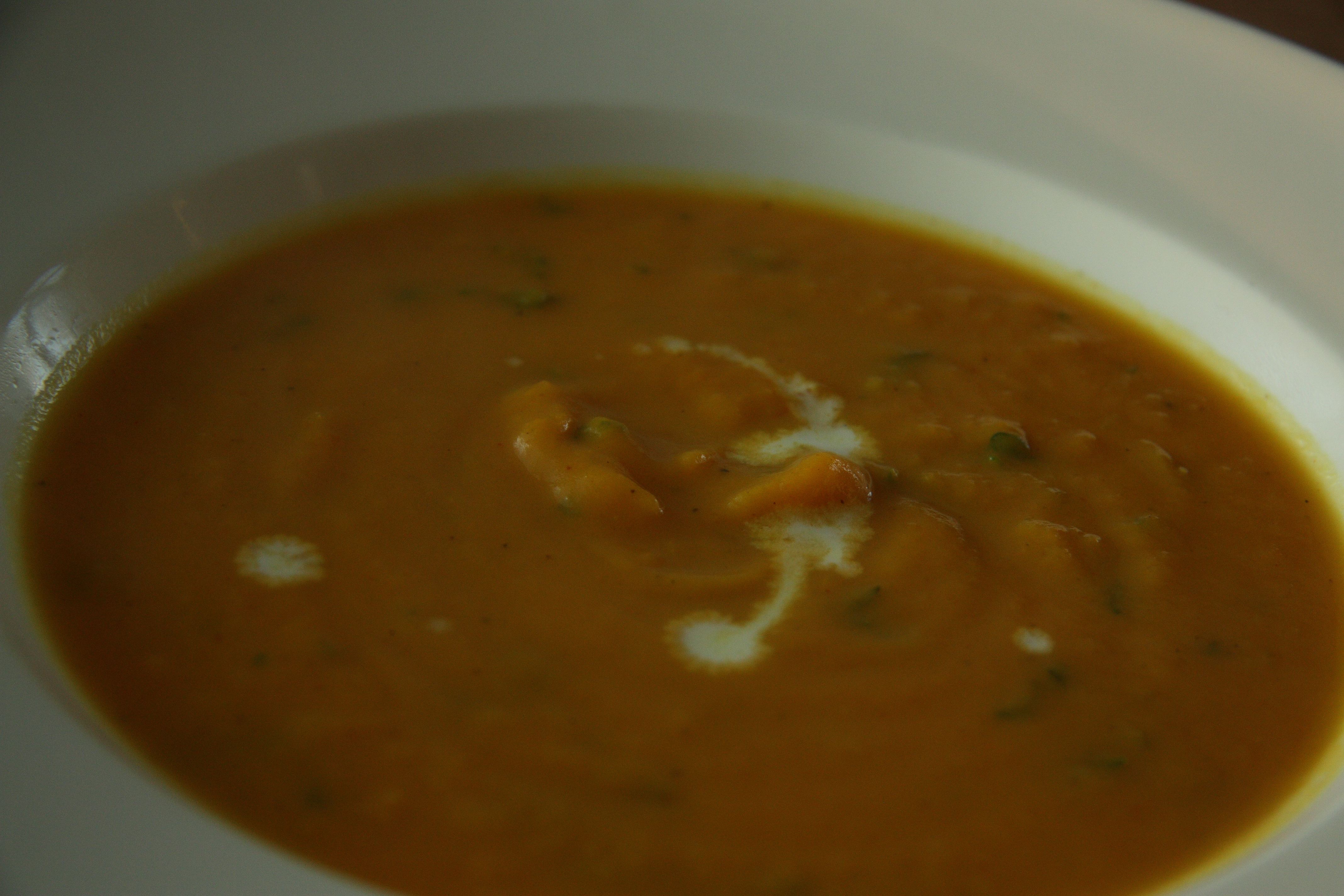 Lisää joukkoon kuoritut ja pilkotut myskikurpitsa, bataatti, ja peruna. Lisää vettä niin, että kaikki kasvikset peittyvät juuri ja juuri. Anna hiljalleen kiehua, kunnes kasvikset ovat pehmentyneet. Lisää muutamia lehtikaalin lehtiä (ruoto leikattu irti) ja muutamiksi palasiksi revittynä ja kourallinen persiljaa hetkeä ennen kuin nostat kattilan liedeltä. Soseuta sauvasekoittimella ja aseta takaisin liedelle. Lisää mausteet ja sitruunanmehu. Lisää viimeisenä ruoka- tai kevytkerma. Kiehauta hetken. Sekoita ja tarkista maku.