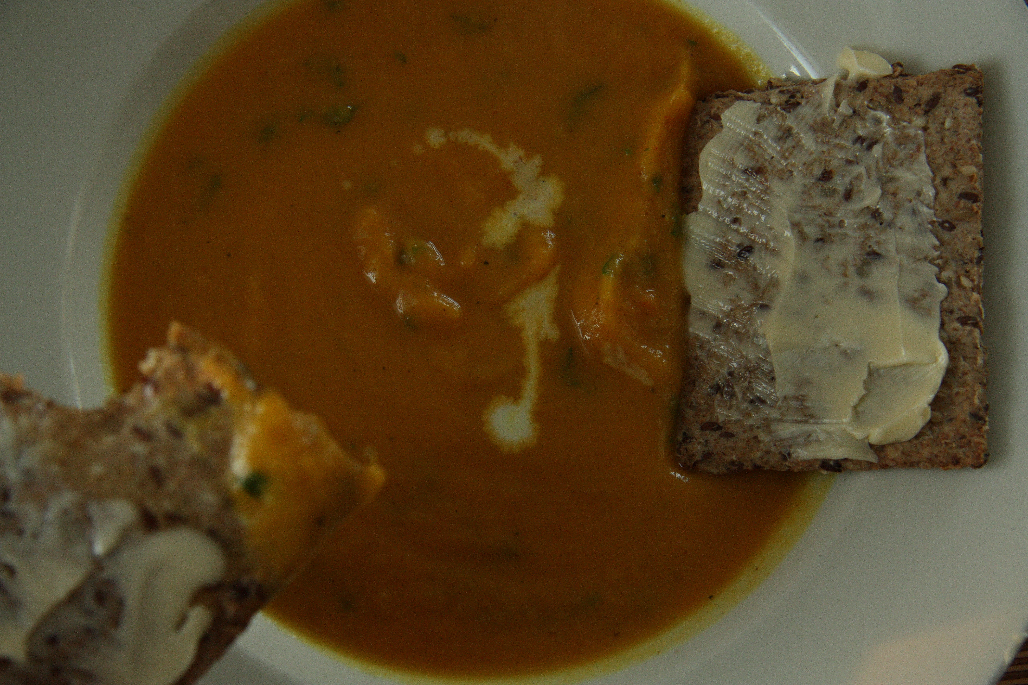 Tarjoile leivän tai skarppinäkkäri kera. Meidän lasten suurta herkkua on dipata leipä tai skarppinäkkäri keitossa. Siitä on tullut perinne aina, kun syömme kasvissosekeittoa.