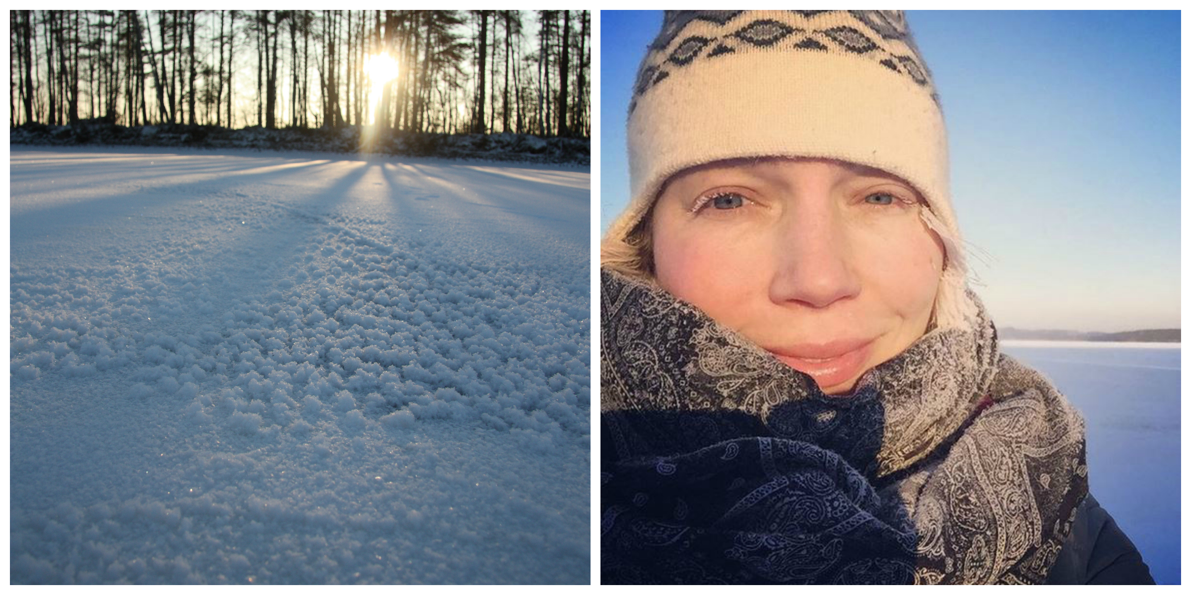 Viime sunnuntaina aurinko paistoi niin, että luonto oli täynnä sinisen sävyä. Oli hyvin kylmää ja kävellessäni järven jäällä tuli sellainen olo, kuin olisin ollut jossain pohjoisnavalla. Silmäripset ja hiukset menivät ihan huurteeseen, ja poskia nipisteli. Lähdin ihan yksin ja vaikka kävelin järvenjäällä vajaan 4 kilometria, hyvä tovi siinä aikaa vierähti, kun pysähdyin vähän väliä nauttimaan siitä rauhoittavasta kauneudesta ja yritin valokuvata niitä maisemia talteen.