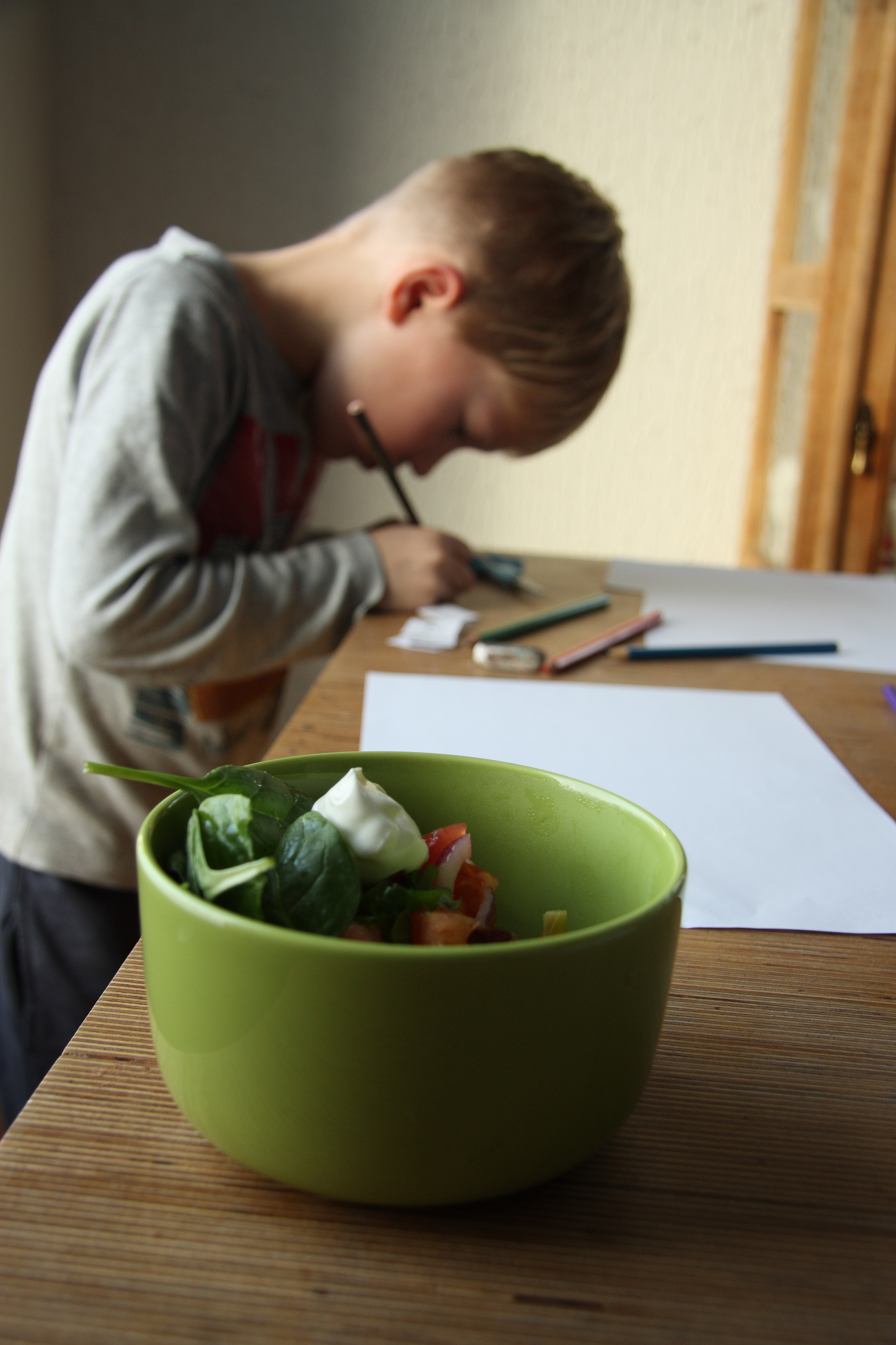 Tarjoiluun créme fraîche ja pinaatinlehtiä
